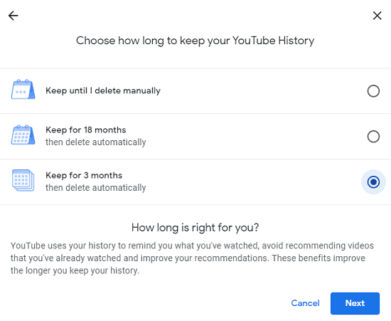 YouTube lets you delete history in three ways—manually, every 3 months, and every 18 months. Select an option and hit on Next.