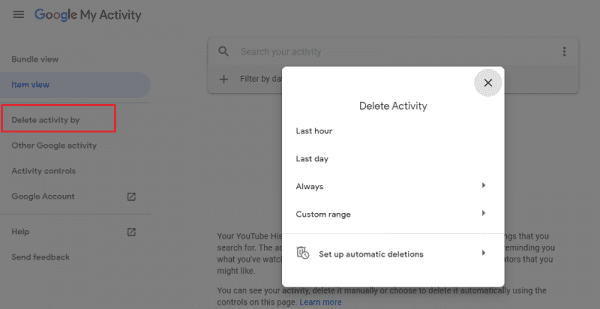 Choose ‘Delete activity by’ from the left pane of your screen. A pop-up box will open to delete activity by last hour, last day, always and within a custom range.